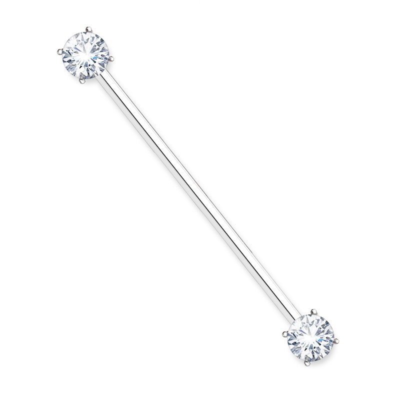 Na fotografia superior mostramos-lhe uma das barras industriais que não encontrará em nenhum outro lugar. A barra desta joia é feita de aço cirúrgico, e em cada uma das suas extremidades encontra uma preciosa zirconia. As zirconias estão dispostas num semicírculo de aço que pertence à estrutura da joia, da mesma cor que a barra. Desta sobressaem quatro pequenas garras que garantem que as zirconias permanecem sempre no sue lugar.