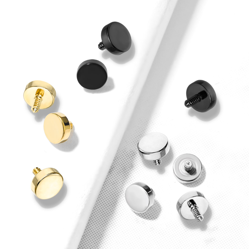 Este pequeno disco redondo destina-se ao uso numa barra com rosca interna. Ou seja, que a bola está aparafusada dentro da barra, onde a bola é aparafusada sobre a barra. A bola pode ser usada em jóias com uma espessura de 1,2 mm. A vantagem das jóias com rosca interna é que reduz o risco de danos internos no seu piercing. Uma barra de enroscar externamente pode facilmente rasgar dentro do piercing quando a barra é empurrada através do orifício - O que não é tão fácil aqui quando a rosca está dentro da barra. O disco, quando a base estiver plana contra a pele, ficará aprox. 1 mm. para cima, pois essa é a altura dela. Está disponível em dois tamanhos diferentes e em três cores diferentes, como pode ver na imagem acima. Os tamanhos são 2 e 3 mm, respectivamente, de diâmetro. O disco é feito de aço cirúrgico, que foi posteriormente revestido com PVD, que é um revestimento que dura melhor que os revestimentos comuns.
