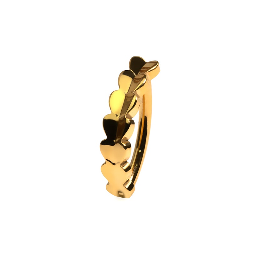Este clicker estiloso para o umbigo é feito de titânio, o que significa que é hipoalergénico e adequado para peles sensíveis. Contém uma fileira fofinha de corações na parte da frente das joias e fecha-se através de uma articulação, facilitando assim a inserção e fixação no piercing.