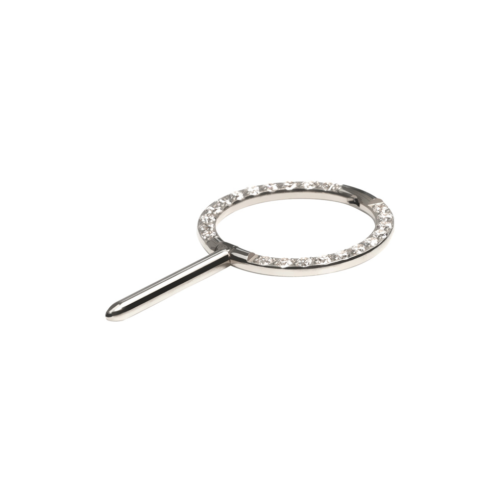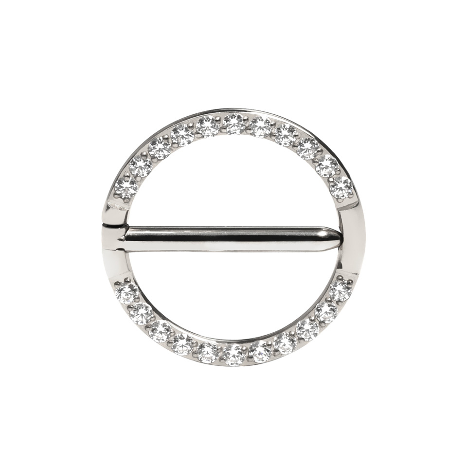 Este clicker deslumbrante em forma de argola e em titânio contém zircónias embutidas, que ficarão perfeitamente dispostas à volta do teu mamilo. O facto de ser feito de titânio faz com que a joia seja hipoalergénicas e muito confortável de utilizar. Está disponível em dois tamanhos diferentes, 12 mm e 14 mm e com acabamento dourado ou prateado.