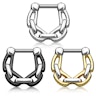 O clicker para septo é feito de puro aço cirúrgico e nenhum latão como na maioria dos modelos. A barra em si mede cerca de 6 mm. e é ligado a uma extremidade que carrega a pequena dobradiça que abre e fecha a joia. Na outra extremidade há um pequeno recesso onde o fio clica para fechar. A própria dobradiça é fixa e não movimenta-se ao seu redor como uma dobradiça comum.