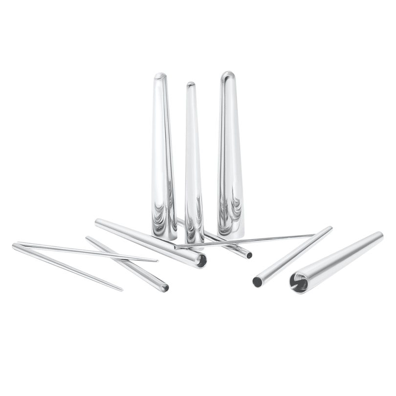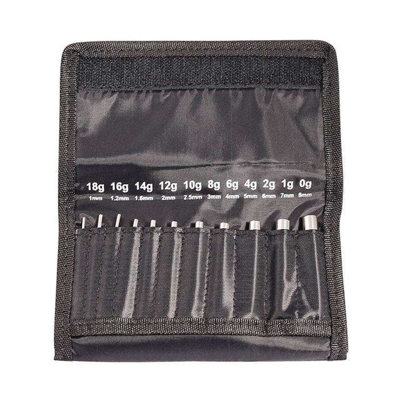 No pequeno conjunto, encontras tapers de 1 mm até 8 mm. No conjunto grande os tamanhos continuam a partir de 10 mm. até 20 mm. Todos os tapers têm em sua extremidade mais grossa uma cavidade correspondente ao tamanho da joia. Isso significa por exemplo que um taper de 10 mm. é na verdade 11 mm. uma vez que a joia deve ser inserida no furo pelo lado mais fino e deve então ser deslizado na orelha. Desta forma tu atinges o tamanho da joia de qualquer maneira e ainda podes usar o furo como apoio ao deslizar a joia. Ou seja a medida da joia é correspondente à medida interna da cavidade.