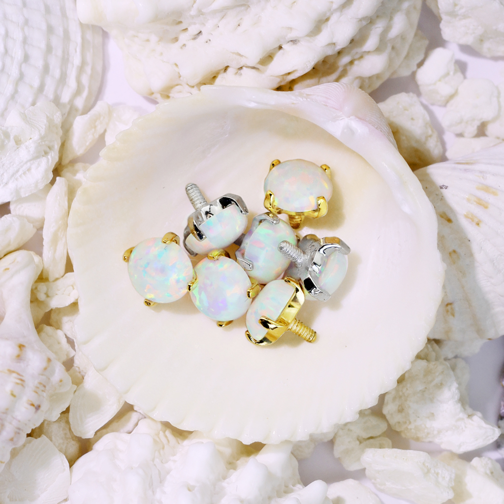A opala é redonda e branca, e está disponível em três tamanhos distintos: 3, 4 e 5 mm, em função de se quer que a joia seja mais ou menos discreta.