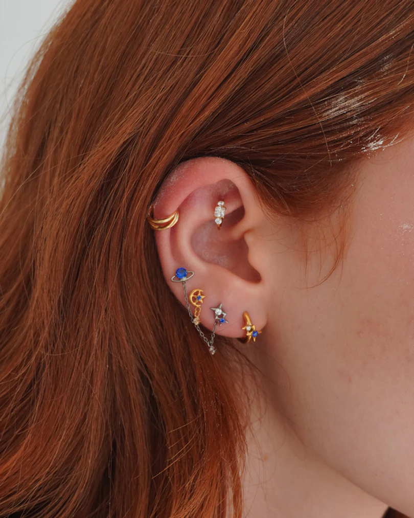 Esta dupla de labrets de titânio espaciais brinca com ligação e movimento. Um dos labrets tem a forma de um pequeno planeta, enquanto o outro contém estrelinhas detalhadas. Estão ligados por uma corrente fina com uma pequena pedra pendurada no centro. As zircónias transparentes e azuis dão um contraste subtil, mantendo o look leve e um pouco espacial sem exageros. Disponível em prateado e feito para usar como par.