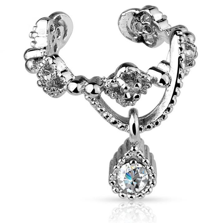 Não existem muitos clips para a orelha com pendente no mercado, pelo que vê à frente dos seus olhos, é uma joia muito especial. O pendente tem forma de gota; parecerá que uma gota cai sobre a sua orelha! O seu centro está decorado com uma pedra redonda de cor cristalina. A pedra está talhada com o conhecido "corte de diamante", o que significa que reflete a luz, graças à sua superfície espelhada. Este efeito brilhante é verdadeiramente grande para uma joia tão pequena, que é digna de qualquer princesa.