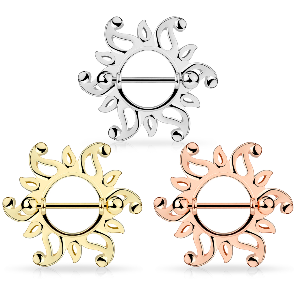 Mamilo piercing em escudo com raios ondulados