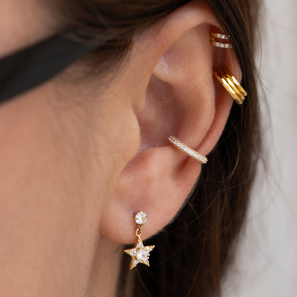 Este labret com rosca interna contém uma pedra na sua bola e um pendente em forma de estrela com pedras incrustadas.