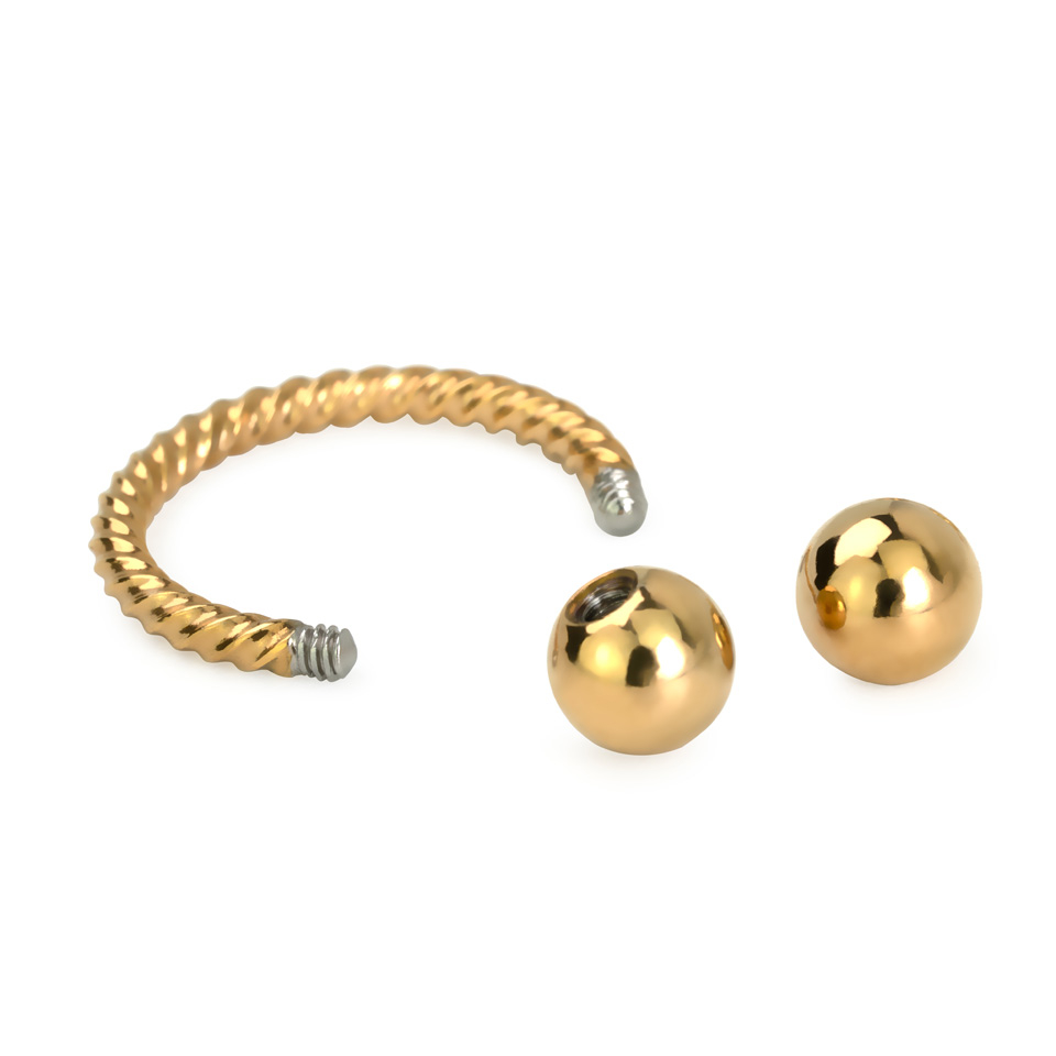 Esta ferradura até parece normal, mas se olhares com atenção, verás os lindos detalhes que percorrem o espaço entre uma bola e outra. A barra é torcida, parecendo-se com uma corda também torcida. Este design dá um toque diferente à joia, conferindo-lhe um visual mais estiloso. Já não se parece mais com um barbell normal.