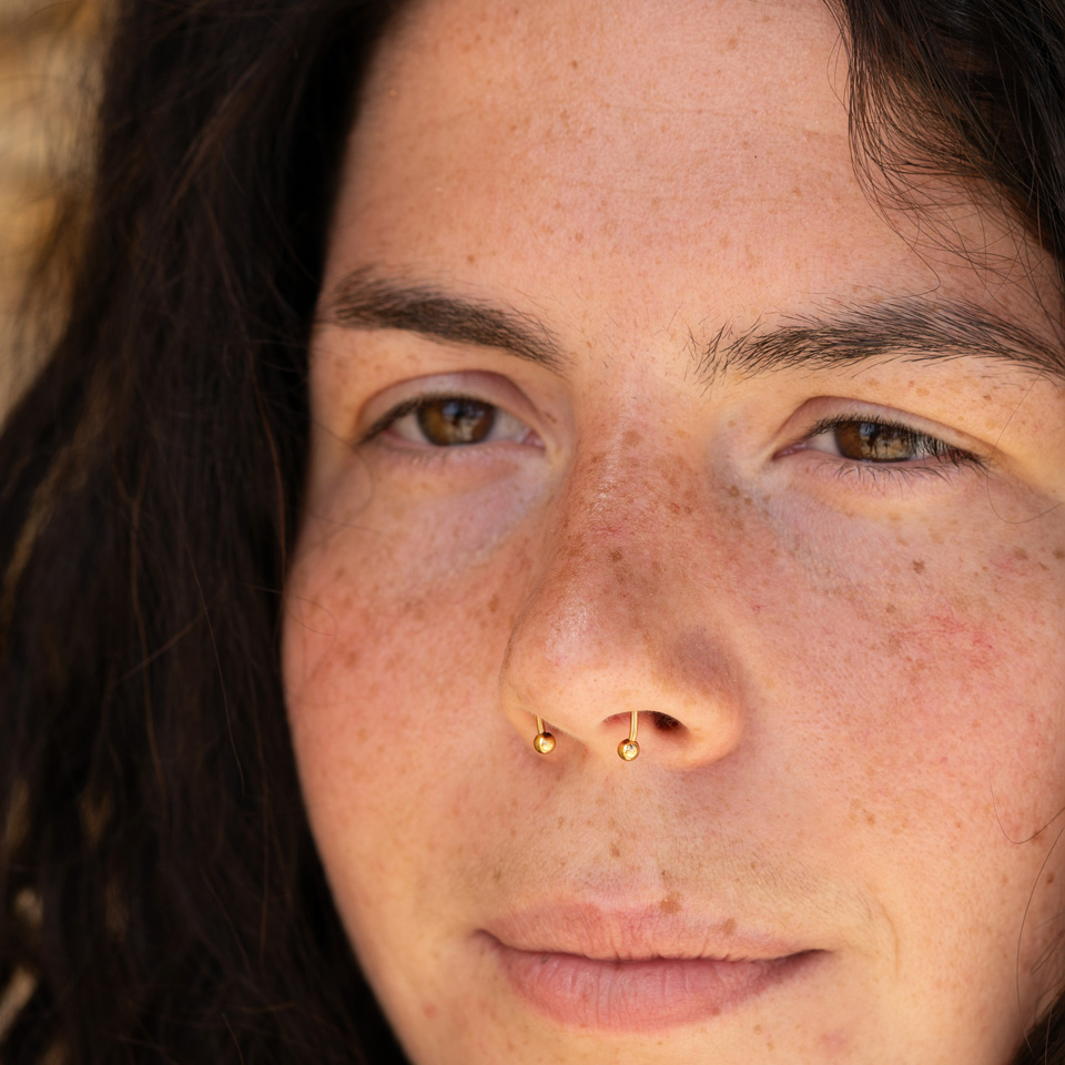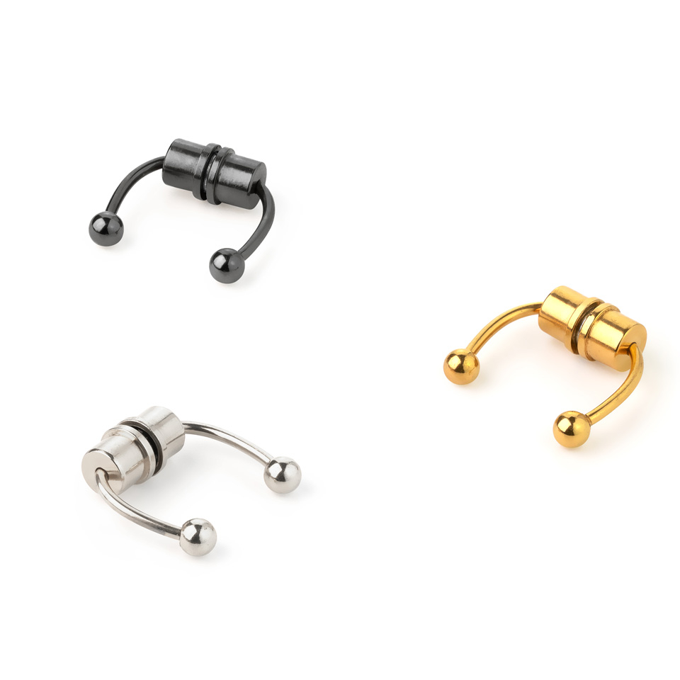 Esta joia é perfeita para uma sessão fotográfica ou para aquelas pessoas que ainda não têm a certeza de se um piercing no septo lhes ficará bem. Os ímanes são feitos para encaixar nas paredes finas do nariz e não na cartilagem que poderás sentir com os dedos. A anatomia e a espessura da tua parede nasal poderão afetar a forma como a peça assentará e a capacidade de atração dos ímanes.