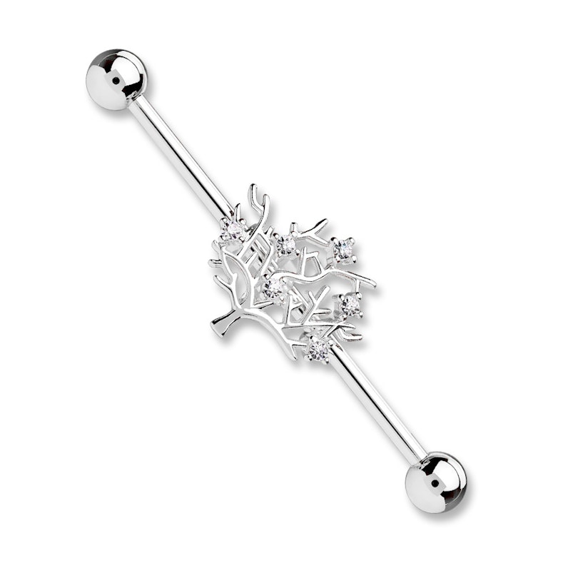 O tipo de árvore que vê nesta barra industrial não está especificada, portanto, pode decidir qual o significado que tem para si. É muito evidente que a árvore não tem folhas, por outro lado, esta tem pequenas pedra de cristal que parecem frutas penduradas nos galhos. Porém, pode interpretá-la como a árvore da vida. A árvore movimenta-se livremente na barra de 38 mm. de comprimento, uma vez que está presa em dois anéis que atravessam a barra. Isto não significa que não possa fixar a árvore onde quiser. Por detrás da árvore há pequenos anéis de borracha que asseguram a árvore onde a quiser deixar.