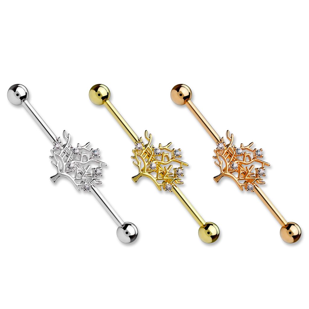 O tipo de árvore que vê nesta barra industrial não está especificada, portanto, pode decidir qual o significado que tem para si. É muito evidente que a árvore não tem folhas, por outro lado, esta tem pequenas pedra de cristal que parecem frutas penduradas nos galhos. Porém, pode interpretá-la como a árvore da vida. A árvore movimenta-se livremente na barra de 38 mm. de comprimento, uma vez que está presa em dois anéis que atravessam a barra. Isto não significa que não possa fixar a árvore onde quiser. Por detrás da árvore há pequenos anéis de borracha que asseguram a árvore onde a quiser deixar.