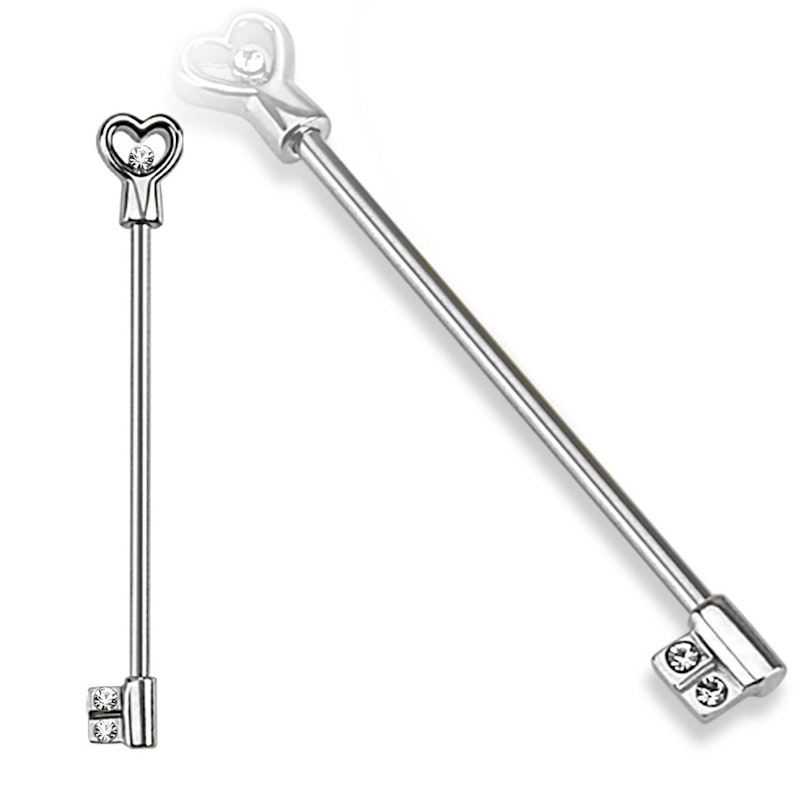 Bela, brilhante e elegante, esta barra industrial é perfeita para a sua orelha. O seu desenho é simplesmente muito doce e feminino: uma chave com um coração. Nos dentes da chave existem dois pequenos brilhantes e também no coração.