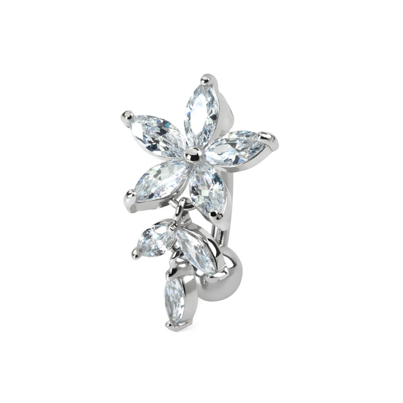 Esta joia para o umbigo tem um pendente que está seguro no topo, ao contrário das restantes joias para o umbigo que o têm preso em baixo. De facto, talvez faça mais sentido colocá-lo no fundo por causa da gravidade; contudo, esta joia tem um ramo a vir de cima, acabando por cobrir o umbigo e a bola. Este tipo de joia é ideal para quem tem um piercing no fundo do umbigo, já que a flor ficará destacada.