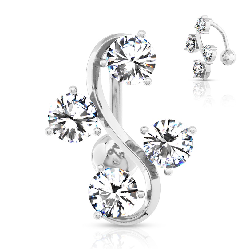 A este tipo de desenho chama-se invertido, pois é ideal para os piercings feitos na parte inferior do umbigo, em vez da superior. E justamente porque tem uma forma de "S", esta joia com 4 brilhantes ficará sempre à frente do umbigo, seja qual for a forma que o coloque. A única diferença é que a bola de fecho fica na parte de cima de um piercing normal, e por baixo num piercing invertido.