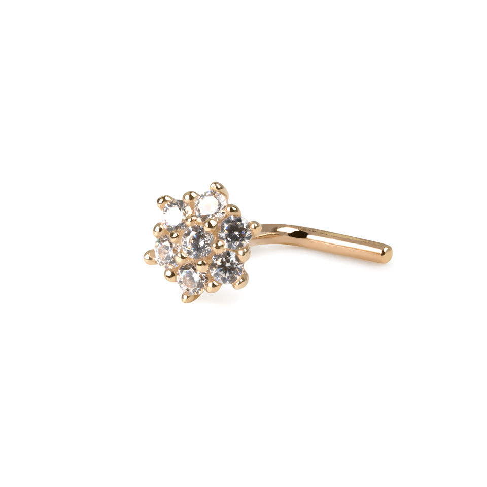 Se estás à procura de uma joia para o nariz doce e feminina, não precisas de procurar mais porque a joia que te apresentamos cumpre todas essas exigências! A joia na qual acabaste de clicar é feita de ouro maciço de 14 quilates. No topo da barra está uma flor linda e brilhante feita de pequenas pedras transparentes. Aliás, melhor ainda, as pedras estão dispostas na forma de uma flor. Esta joia, também conhecida como stud, tem um ângulo de 90°, que a permite ficar segura no nariz sem risco de cair.