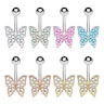 Este belo piercing para o umbigo com charmosa borboleta, é digno dos dias de verão. A joia é feita é aço cirúrgico, e a sua frente em bronze. A parte frontal foi moldada em forma de borboleta, e tem as suas asas repletas de brilhantes coloridos.