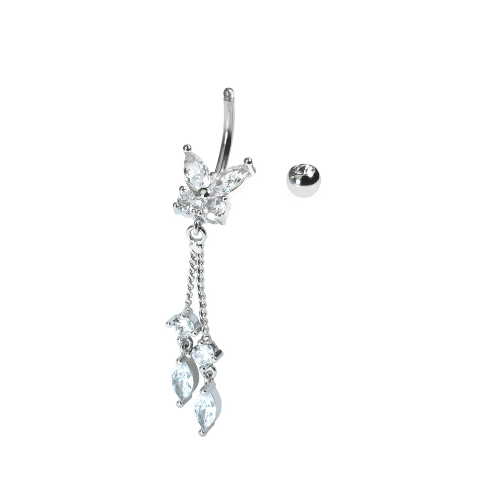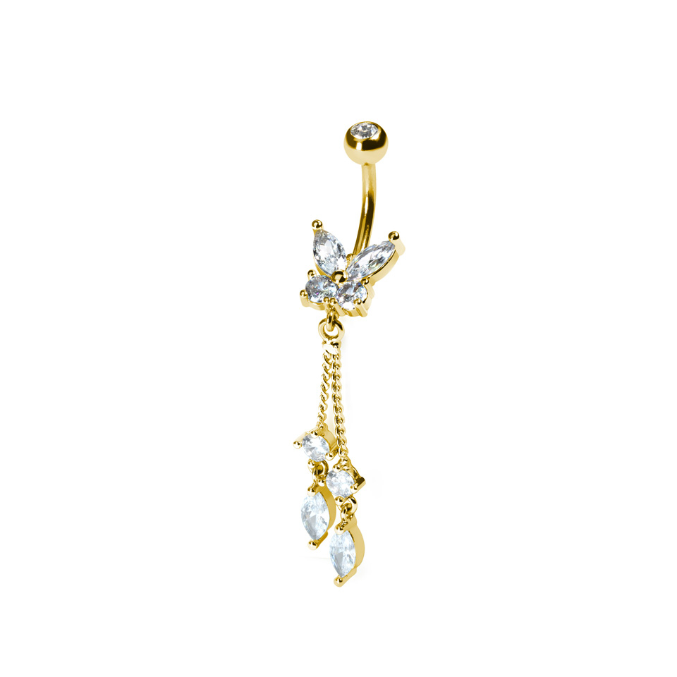 Esta joia brilhante para o umbigo contém uma linda borboleta no fundo e pendentes com ainda mais pedras brilhantes, que estão presas através de correntes ao fundo da borboleta.