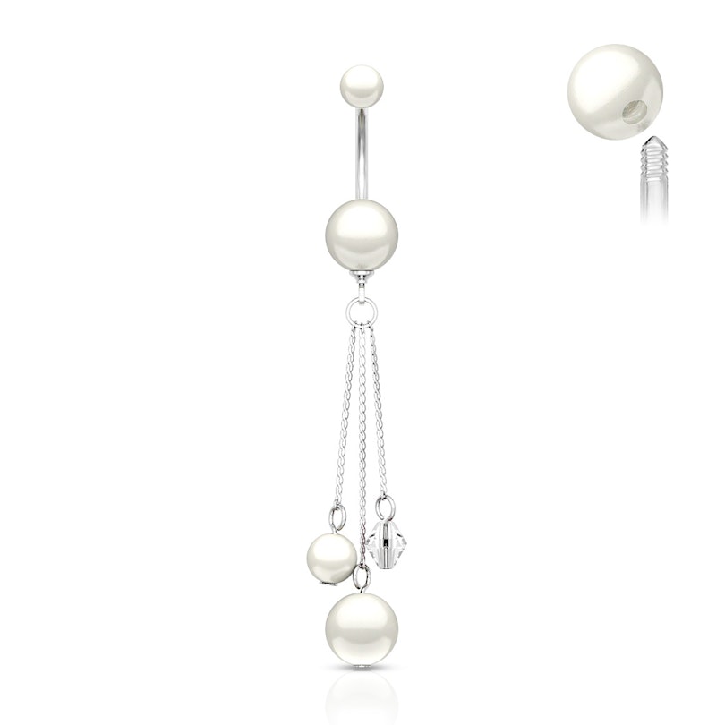 Apresentamos-te uma joia fofinha para o umbigo em aço cirúrgico com contas de acrílico. É uma joia clássica e com vários pendentes. Há três pendentes de diferentes tamanhos presos à bola inferior com um design assimétrico. Uma das bolas tem a forma de um diamante. Todas as bolas e contas têm a mesma cor.