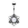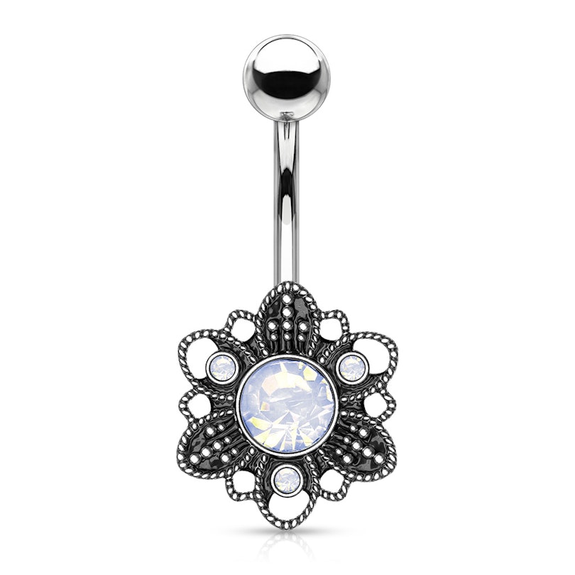 Esta joia para o umbigo é composta por um barbell de aço cirúrgico e uma flor, no fundo, feita de latão. A flor é revestida com prata antiga, o que lhe confere uma cor oxidada e escura. Ao redor da flor existem pequenos detalhes que lhe dão caráter.