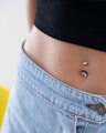 Se gostas imenso de joias para umbigo com pedras grandes, vieste ao sítio certo. Na imagem acima, é possível ver uma joia para o umbigo feita de aço cirúrgico, revestida com vários processos de coloração. Tanto a bola superior como a inferior contêm uma zircónia, cortada em diferentes ângulos, garantindo a reflexão absoluta da luz.