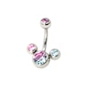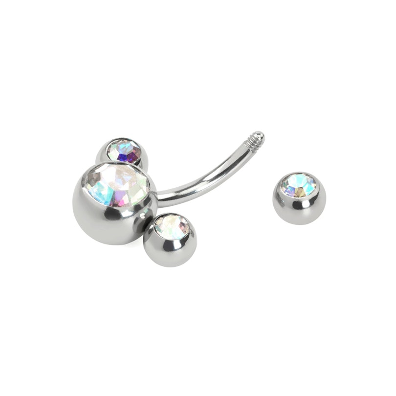 Esta joia para o umbigo, em particular, tem uma forma que todos conhecem, mesmo no fundo do barbell curvo com 10 mm e uma bola no topo e no fundo. A diferença é que este barbell tem duas bolas ligadas à bola do fundo, sendo que cada bola tem uma pedra colorida, disponível em várias cores de entre as quais podes escolher.