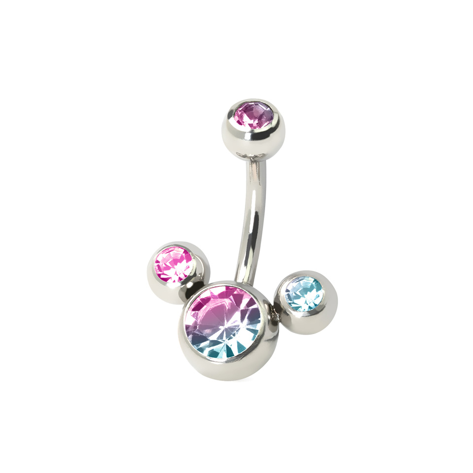 Esta joia para o umbigo, em particular, tem uma forma que todos conhecem, mesmo no fundo do barbell curvo com 10 mm e uma bola no topo e no fundo. A diferença é que este barbell tem duas bolas ligadas à bola do fundo, sendo que cada bola tem uma pedra colorida, disponível em várias cores de entre as quais podes escolher.
