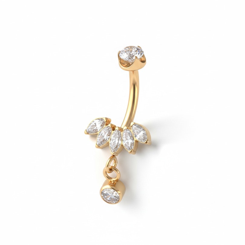 Vem conhecer a tua nova desculpa para te gabares do teu umbigo. Esta joia para o umbigo em titânio com pedras e pendente é hipoalergénica e resistente à água (exato, não há cá ferrugem ou irritações).