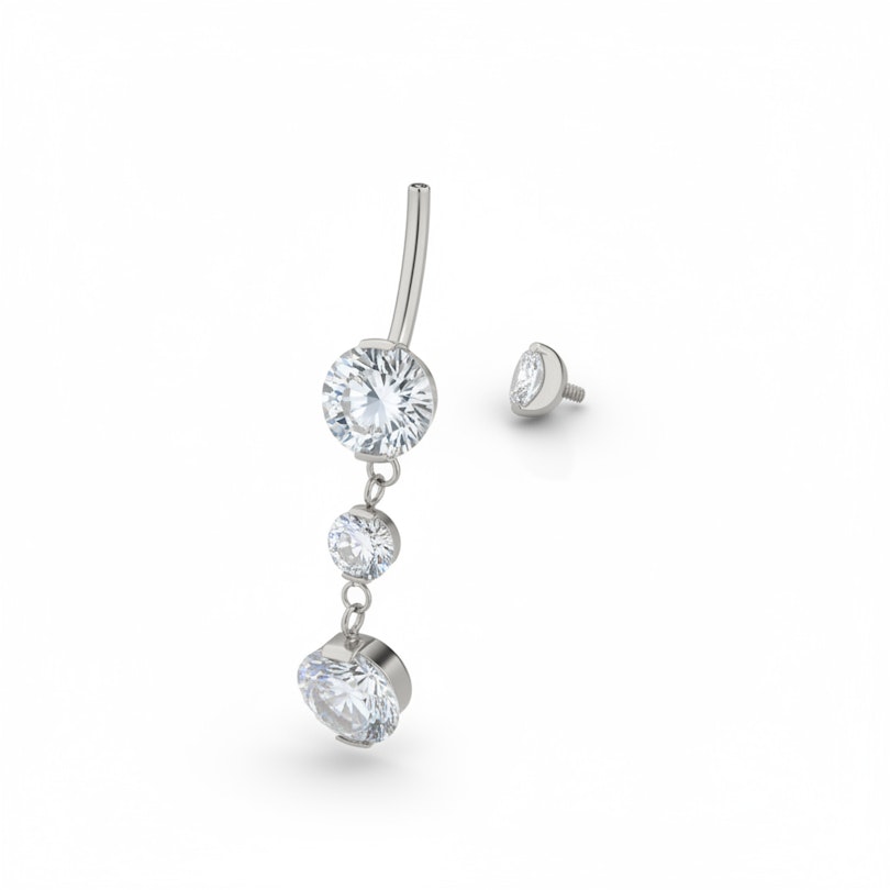 Esta deslumbrante joia para o umbigo em titânio com pendente contém 4 pedras embutidas, uma em cada bola e duas no pendente. No total, a parte do pendente, desde a bola do fundo à ponta do pendente, tem cerca de 3 cm. Esta joia tem rosca interna, o que significa que só a barra macia é que passa no piercing. Para a segurar, basta enroscar o topo. O titânio é hipoalergénico e resistente à água, o que significa que esta joia é perfeita para aqueles dias na piscina.