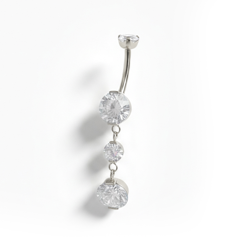 Esta deslumbrante joia para o umbigo em titânio com pendente contém 4 pedras embutidas, uma em cada bola e duas no pendente. No total, a parte do pendente, desde a bola do fundo à ponta do pendente, tem cerca de 3 cm. Esta joia tem rosca interna, o que significa que só a barra macia é que passa no piercing. Para a segurar, basta enroscar o topo. O titânio é hipoalergénico e resistente à água, o que significa que esta joia é perfeita para aqueles dias na piscina.