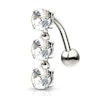 A barra recta deste piercing mede cerca de 10 mm de comprimento. A bola superior é uma bonita zirconia, igual às duas que suspendem dela, que ao estarem integradas numa corrente, acompanharam os movimentos do seu corpo.