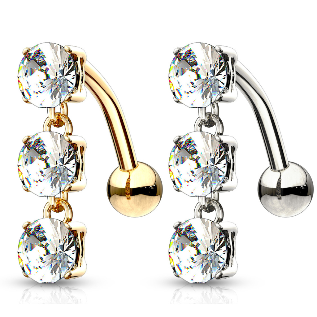 A barra recta deste piercing mede cerca de 10 mm de comprimento. A bola superior é uma bonita zirconia, igual às duas que suspendem dela, que ao estarem integradas numa corrente, acompanharam os movimentos do seu corpo.