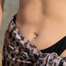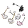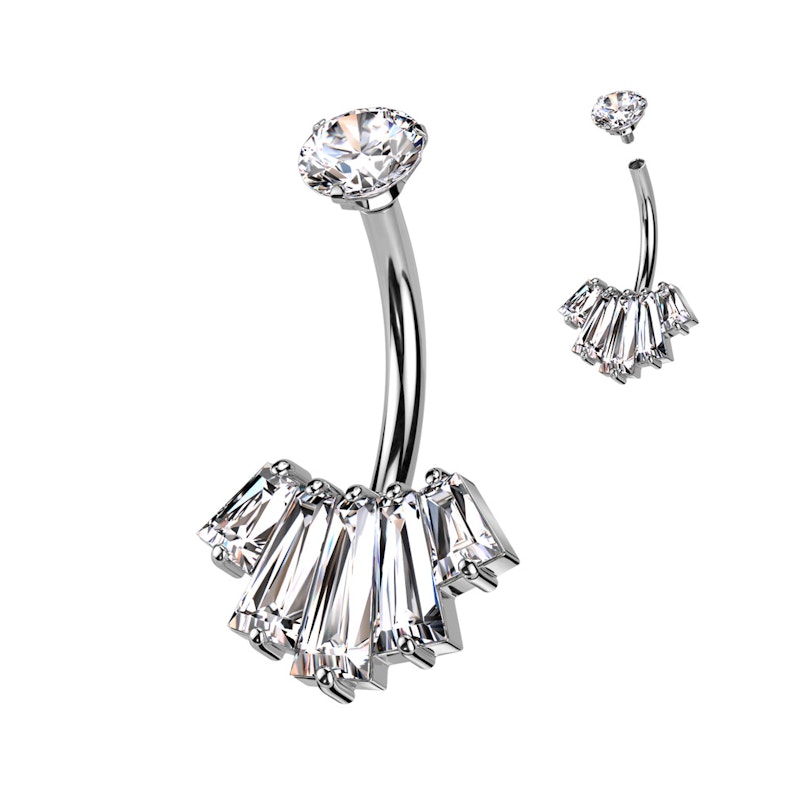 Joia para o umbigo estilosa com zircónias em corte baguete dispostas em leque ao estilo de Art Deco. Esta joia feita em aço cirúrgico assegura uma maior durabilidade e conforto. Tem uma espessura de 1,6 mm e um comprimento de 10 mm, oferecendo as medidas ideais para a maioria dos piercings no umbigo. A rosca interna torna a joia simples e confortável de inserir no piercing. Está disponível em três cores clássicas: prateado, dourado e ouro rosa. Este estilo intemporal vai ajudar-te a completar qualquer estilo.