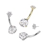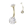 Esta joia para o umbigo em titânio contém uma zircónia cúbica brilhante no fundo e uma flor fofinha no topo, também feita de pedras semipreciosas transparentes.