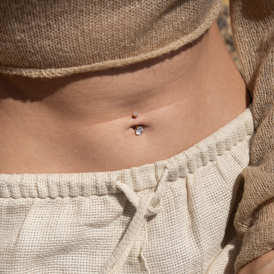 Por ser feita de titânio, significa que é antialérgica, durável, leve e resistente à corrosão, sendo a joia ideal para pele sensível e para uma utilização a longo prazo e confortável, no geral. O seu mecanismo de encaixe oferece uma colocação e mudança de joia sem esforço. Com a sua espessura de 1,6 mm e o seu comprimento de 10 mm, será uma aposta confortável para a maioria dos piercings no umbigo. A flor tem 5 mm na horizontal e a pedra tem 8 mm. Está disponível em dourado ou prateado. Mostra o teu glamour com esta linda joia.