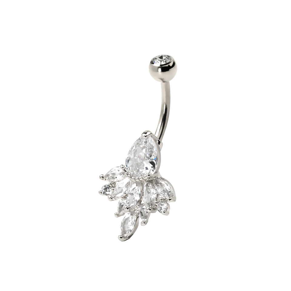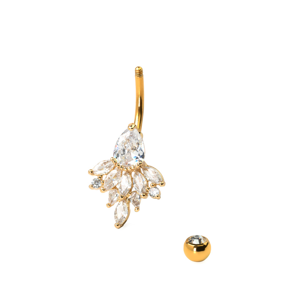 Este piercing de umbigo à primeira vista é exactamente como estas joias geralmente são. Uma barra curvada com cerca de 10 mm. e uma bola superior com uma pedra translúcida. Porém, olhando-a com mais atenção é possível ver que a bola inferior foi substituída por uma pedra em formato de gota. Abaixo dessa gota encontra-se um conjunto de pedras também em formato de gotas e alongadas, ou mais especificamente chamado de corte marquise. Abaixo da pedra gota encontram-se 5 pedras em corte marquise e abaixo dessas outras 4 pedras em formato de gota (uma entre cada é alongada). Esta linda e extravagante joia termina então com uma pedra alongada na parte inferior.