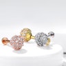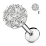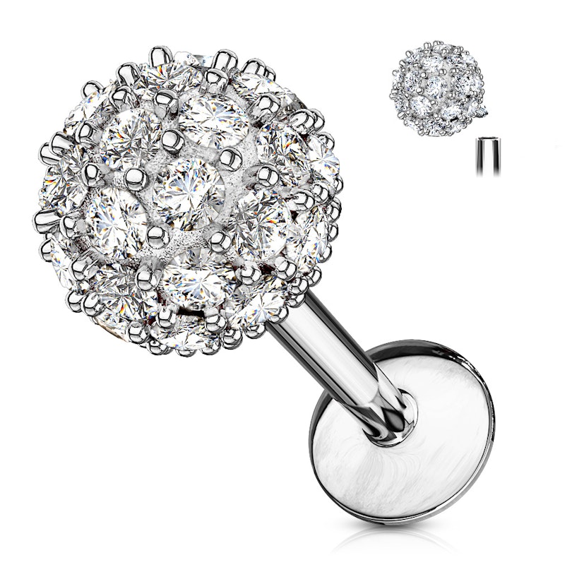 A joia que te apresentamos contém uma bola de 6 mm de diâmetro. Esta bola é encrustada com pedrinhas brilhantes, que brilham fortemente quando a luz incide sobre elas, tornando este labret muito chamativo.