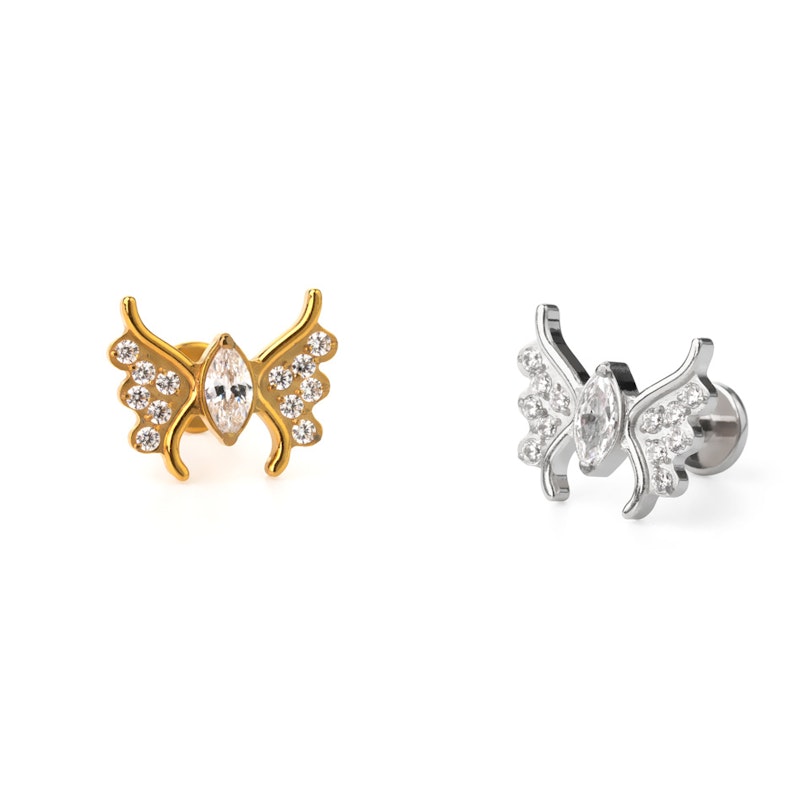 Este labret com detalhes deliciosos tem a forma de uma borboleta. O corpo é feito com uma zircónia cúbica oval embutida e as asas delicadas contêm 6 pedrinhas incrustadas. Esta peça foi feita em titânio e é durável e antialérgica. Com a sua rosca interna, inserir e remover o piercing será mesmo fácil e confortável. Esta borboleta será um complemento encantador aos teus conjuntos da orelha.