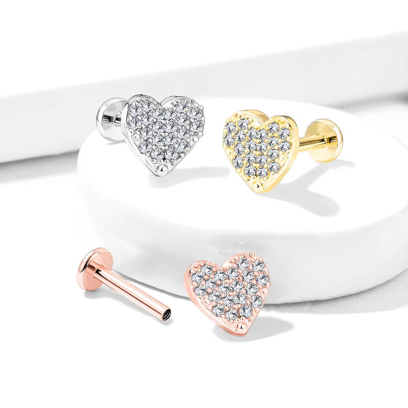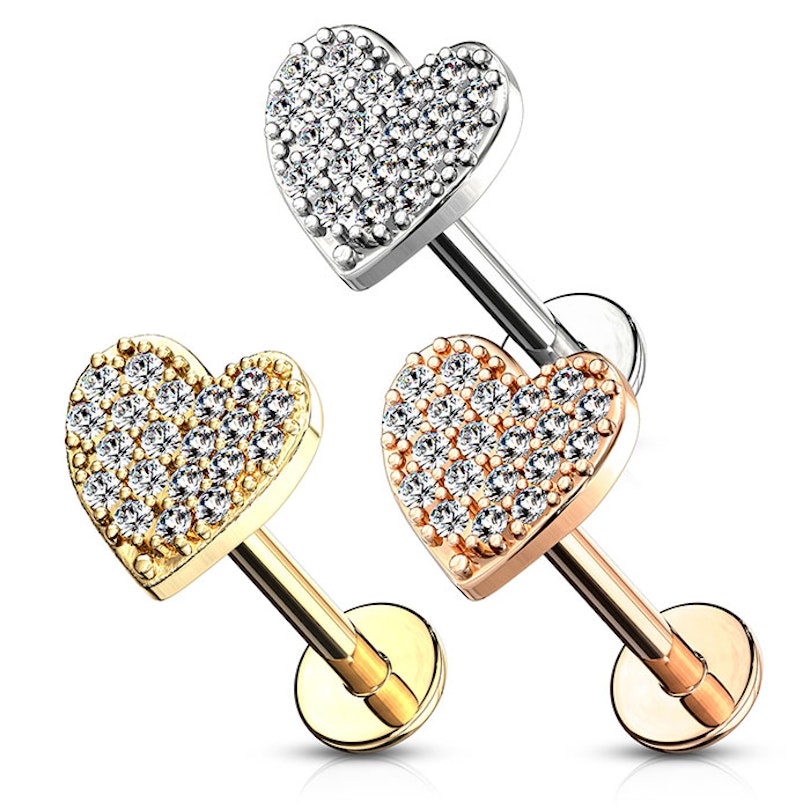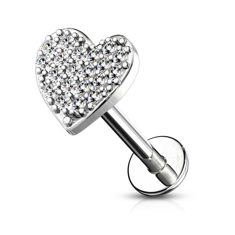 As joias para piercings em forma de coração são inacreditavelmente populares e o labret, no qual acabaste de clicar, também contém um coração, que por sua vez tem algo de diferente. O coração está cravejado de várias pedrinhas transparentes que o fazem brilhar.