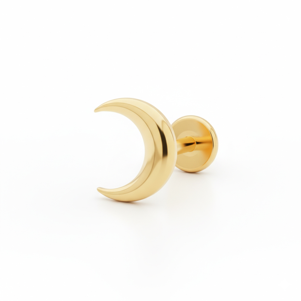 Este labret com quarto decrescente em titânio foi feito a pensar naquelas noites longas e nas manhãs que nascem cedo demais, e no silêncio entre cada hora em que tudo parece mais pessoal. A sua forma decrescente, disponível em dourado e prateado, mantém o teu conjunto da orelha, minimalista e equilibrado.