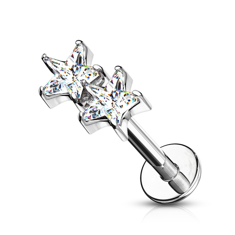 O que é melhor do que uma estrelas? Duas estrelas, é claro! É exatamente isso que vais obter com este labret estonteante. Adiciona esta joia aos teus piercings na orelha e todos ficarão admirados com o brilho emanado pelas lindas estrelas. O labret contém ainda uma rosca interna, tornando-se mais fácil de inserir no piercing do que com uma rosca externa.