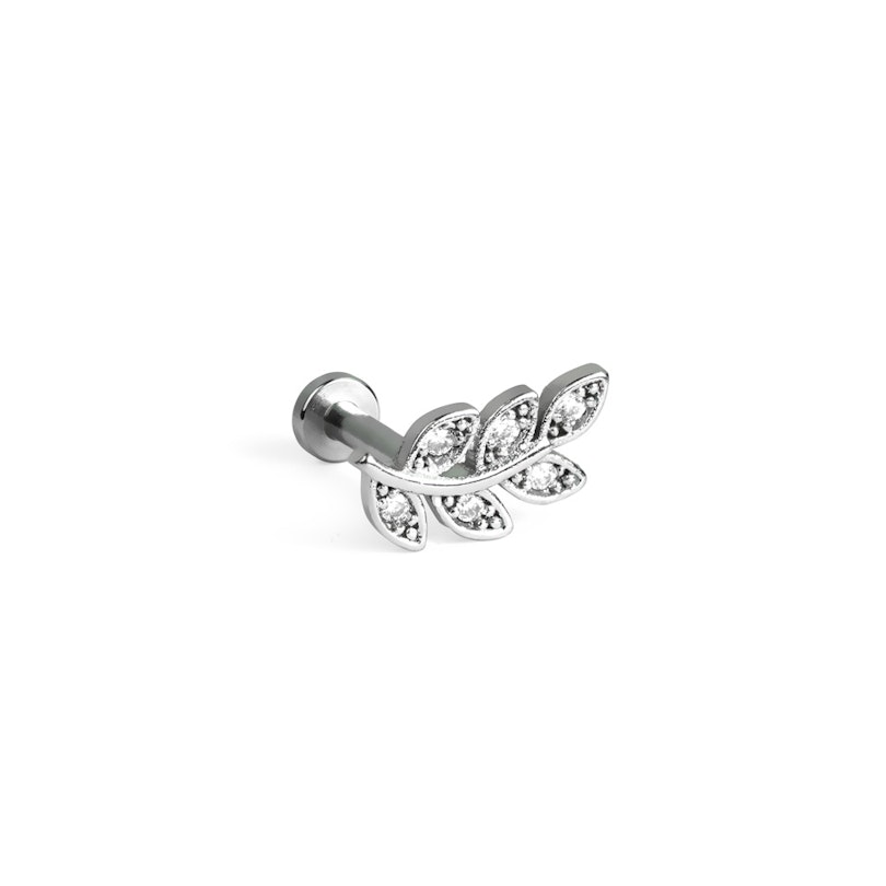 As folhas são especialmente desenhadas para piercings na orelha, porque têm uma forma curva com zircónias cúbicas brilhantes. O desenho das folhas tem 4,8 x 9,5 mm e a barra tem uma espessura de 1,2 mm. Podes utilizar, por exemplo, esta joia no teu helix, no tragus, no conch ou no lóbulo. Esta peça está disponível em dois tamanhos: 6 mm ou 8 mm para que assente de forma confortável no teu piercing.