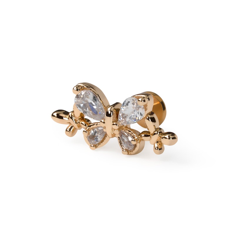 Este labret com três borboletas caracteriza-se pelos seus detalhes divertidos. No centro podemos ver uma borboleta grande, composta por pedras transparentes e presas por garras, e em cada lado está uma borboleta mais pequenina dourada, formando um trio cheio de caráter.