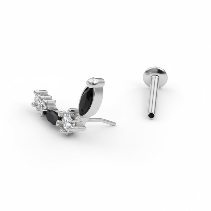 Este labret curvo com pedras pretas e transparentes caracteriza-se pelo seu ritmo e contraste. Nesta joia podemos ver quatro pedras presas com garras, que vão alternando entre preto e transparente, e que seguem a ligeira curva que chama a atenção sem escandalizar.
