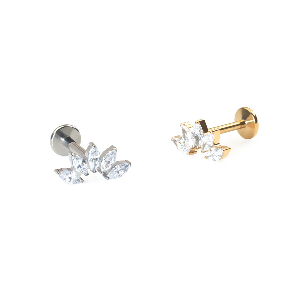 Este labret em titânio contém 5 zircónias cúbicas em corte marquesa dispostas em curva. Esta joia contém rosca interna, o que significa que para a inserires basta passar a barra suave no piercing e enroscar o topo para segurar. É feita de titânio, por isso, é segura até para quem tem a pele sensível. É indicada para vários piercings na orelha e ficará particularmente bem no piercing no helix ou no flat.