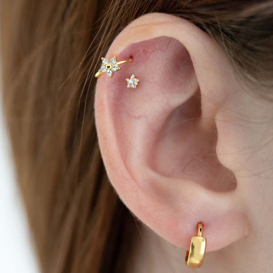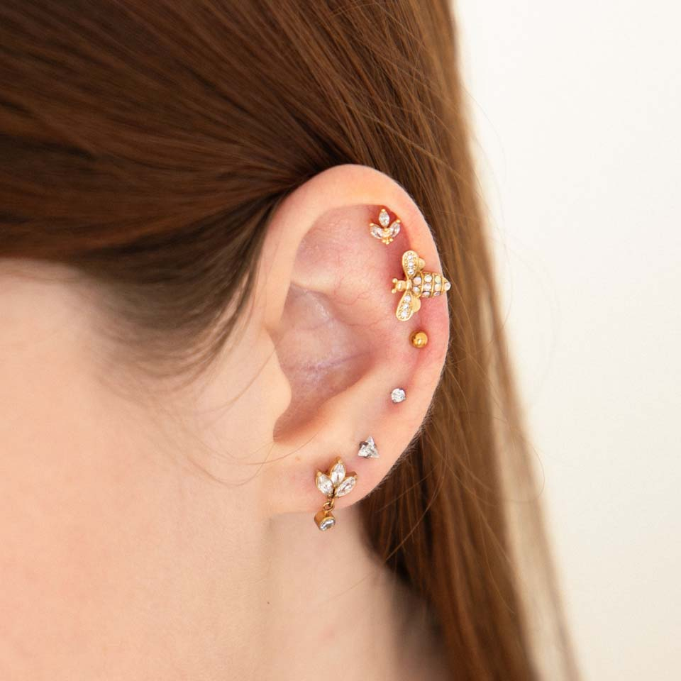 Posição: Tragus, Spiderbite, Snakebite, Medusa, Madonna, Labret inferior, Lóbulo, Helix, Conch, Anti-helix, Angelbite