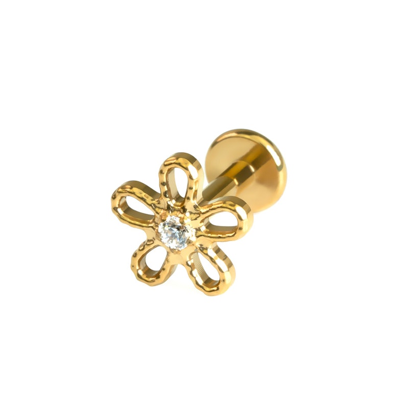 O nosso labret encantador em forma de margarida contém uma zircónia cúbica central para um toque de brilho. Graças à sua rosca interna, torna-se simples de utilizar: basta inserir a barra suave no piercing e rodar o topo para fixar. A joia é feita de titânio hipoalergénico, tornando-se assim ideal para peles sensíveis. Está disponível com acabamento em dourado e prateado e também podes escolher o comprimento que mais se adequa ao teu piercing. Dá um toque fofinho ao teu visual com esta margarida.