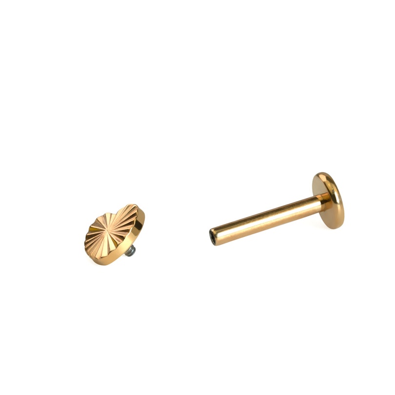 Este charmoso labret em forma de coração contém um lindo topo com saliências, concebido para linhas subtis que irradiam do centro, criando um efeito marcante quando bate a luz.