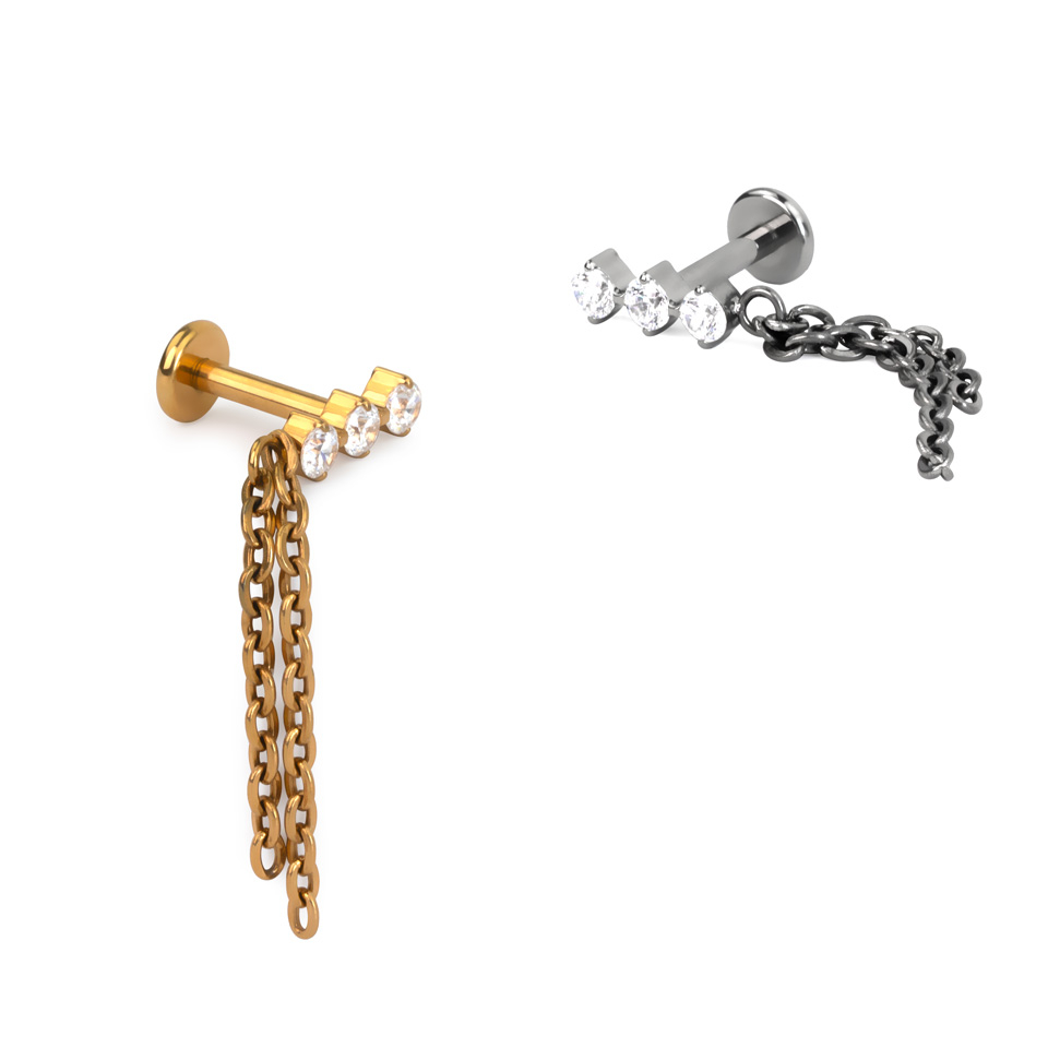 Labret em titânio com 3 pedras e 2 correntes