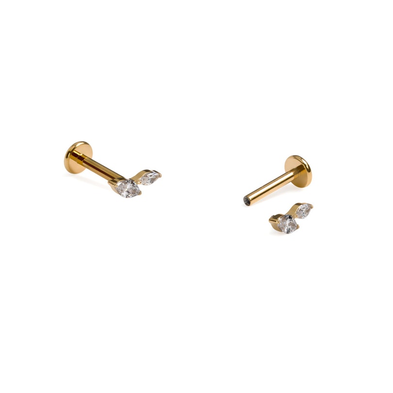 Este labret em titânio com duas pedras em corte marquesa é a prova de que menos pode fazer muito mais. As duas pedras iguais estão dispostas lado a lado, assemelhando-se a folhas ou asas e dando um toque especial ao teu conjunto sem roubar todas as atenções.