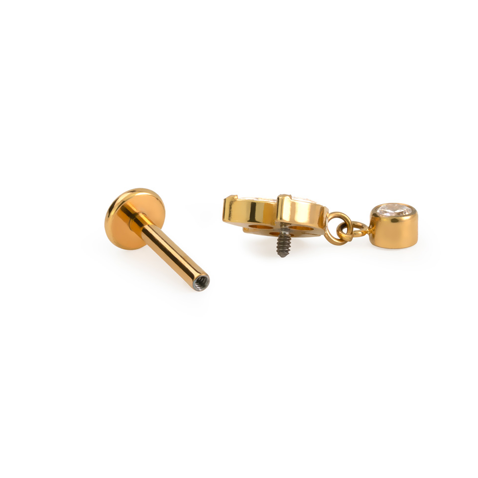 É uma joia com rosca interna e é fácil de inserir e remover, visto que a parte que é inserida é completamente suave. É feita de titânio, um material antialérgico, é resistente e não enferruja.